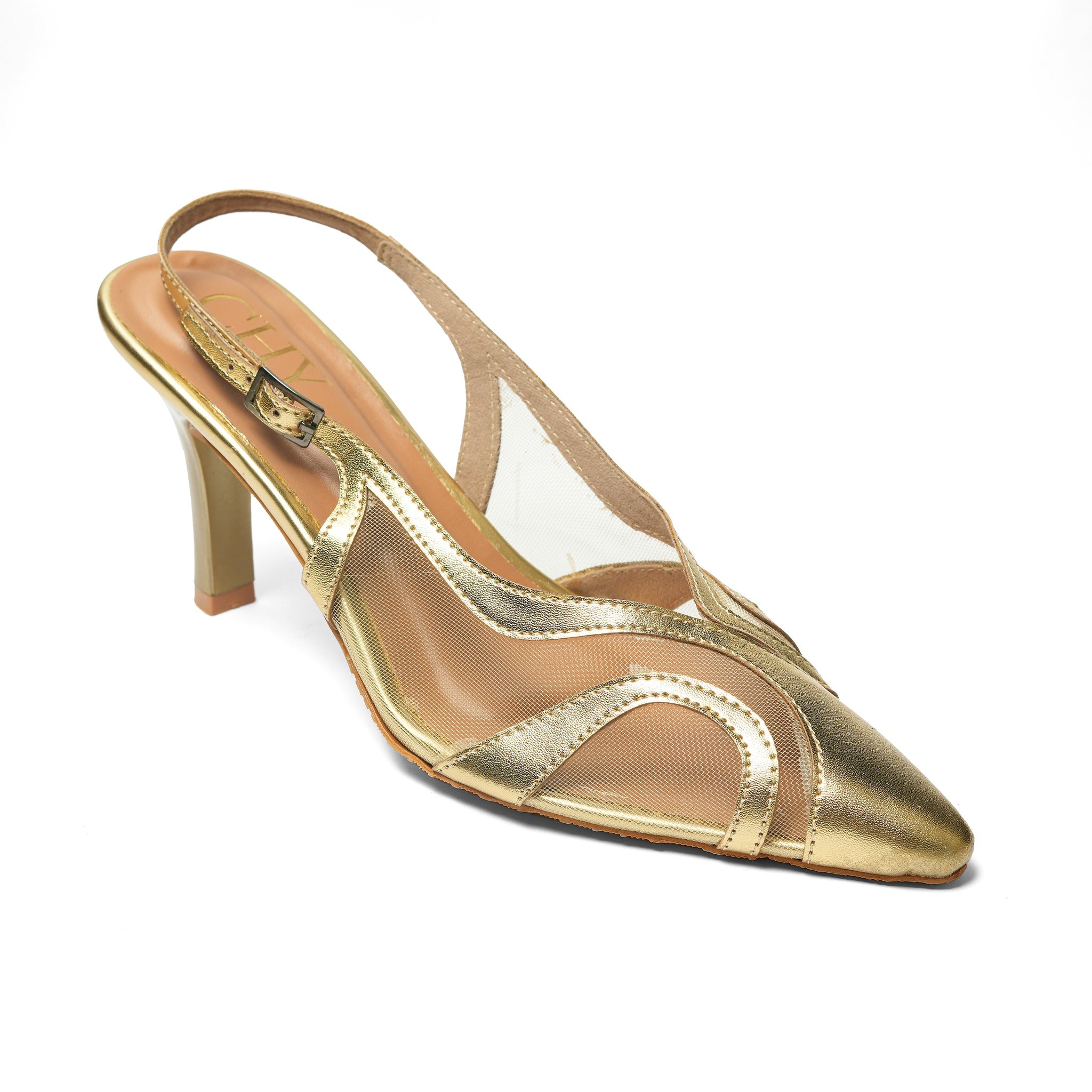 Chic gold mesh slingback heels featuring a sleek pointed toe and adjustable buckle strap. Elegant, lightweight, and ideal for evening parties and formal occasions.