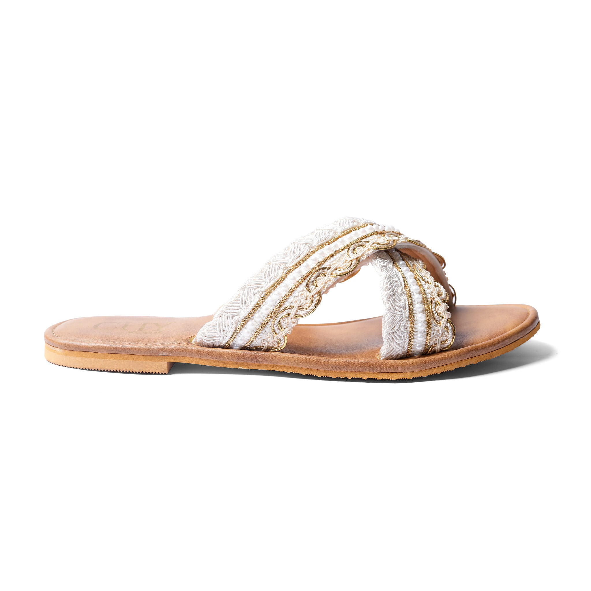 Add a touch of elegance to your everyday style with Noor Cross Flat. Featuring a beautifully braided cross-strap design with intricate thread work and delicate pearl detailing, this pair blends ethnic charm with modern comfort. The soft beige tone and cushioned sole make it perfect for festive wear, brunch outings, or casual days that call for effortless grace.