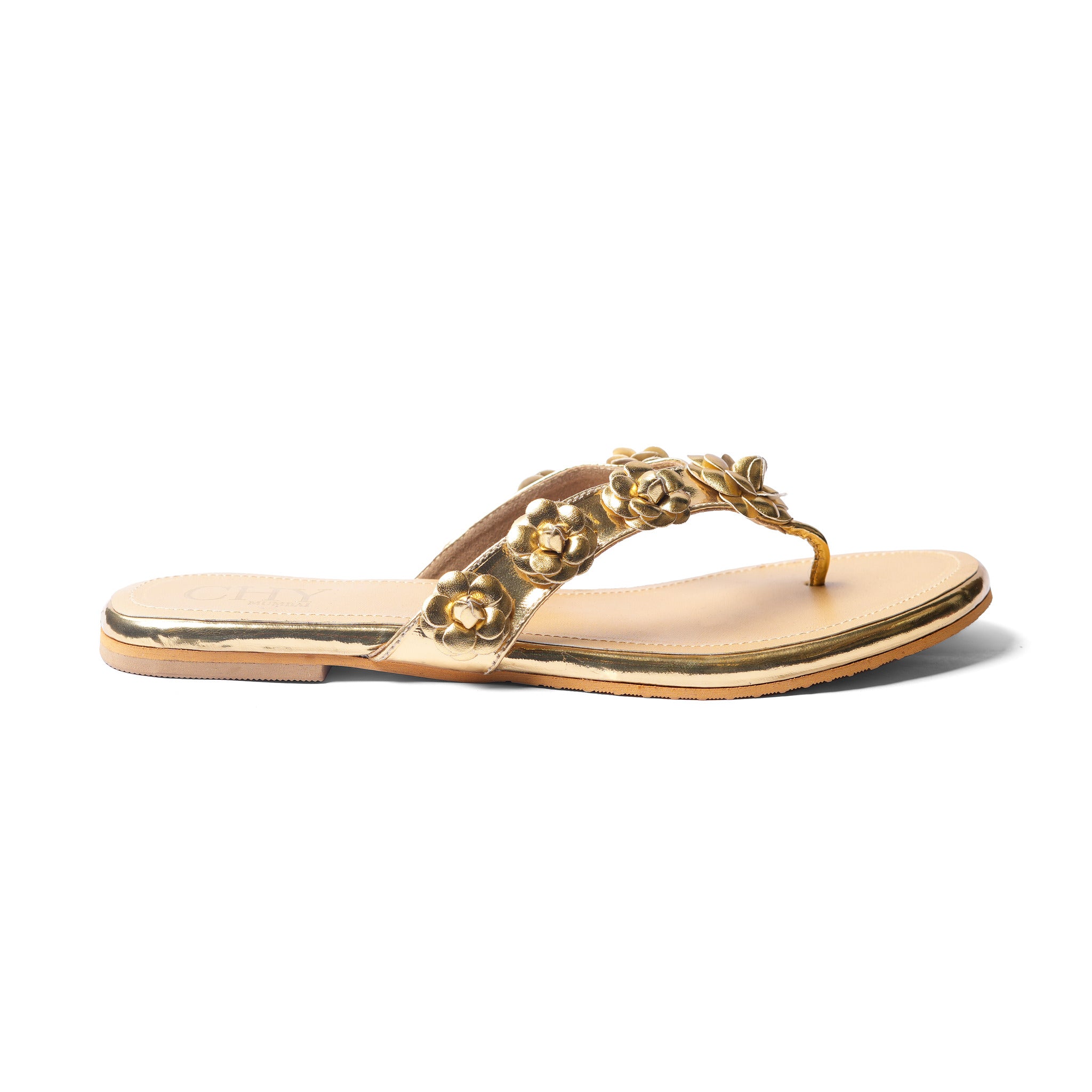 Add a touch of charm to your look with these golden floral flats. The glossy finish and delicate flower details bring effortless elegance and comfort, perfect for festive days or evening outings.