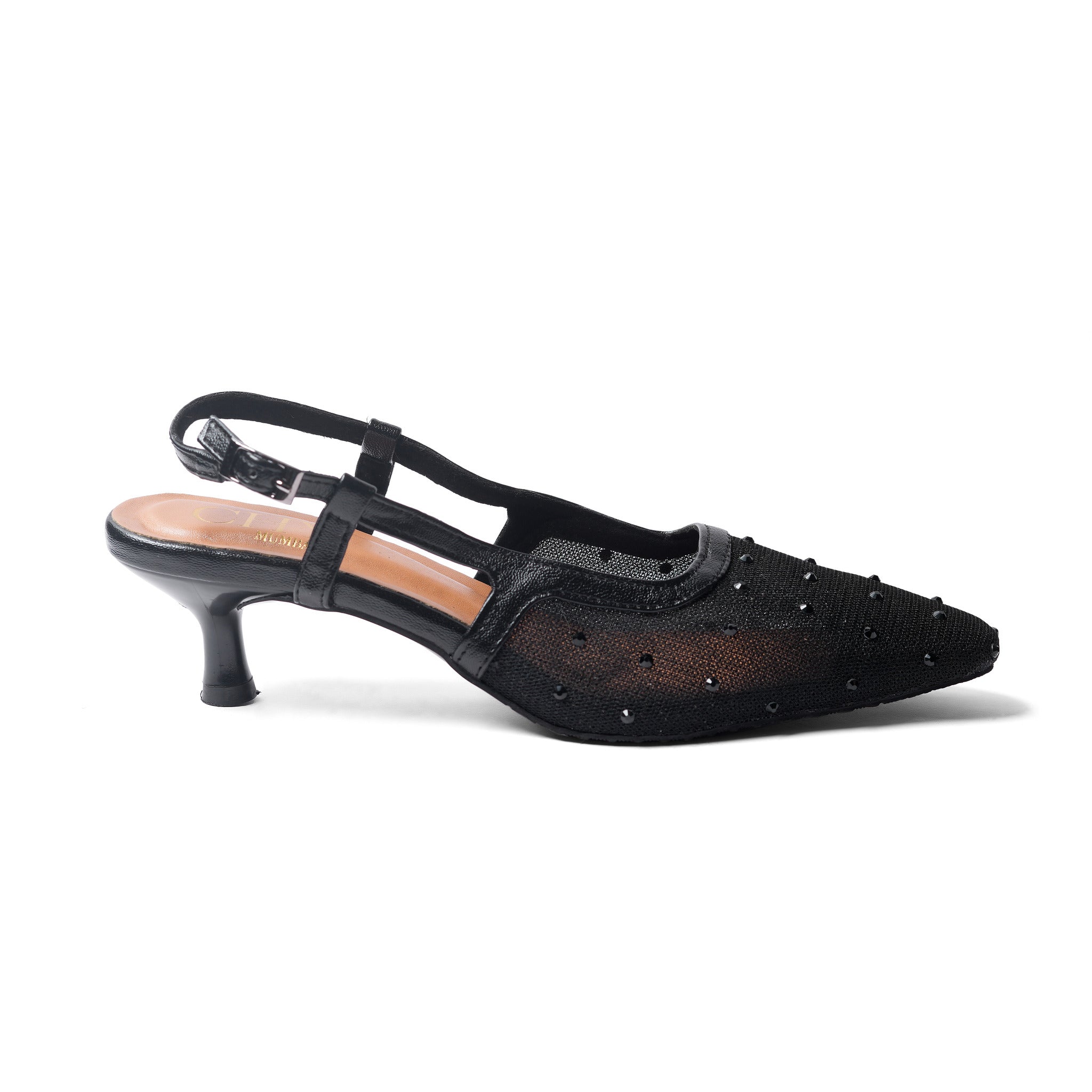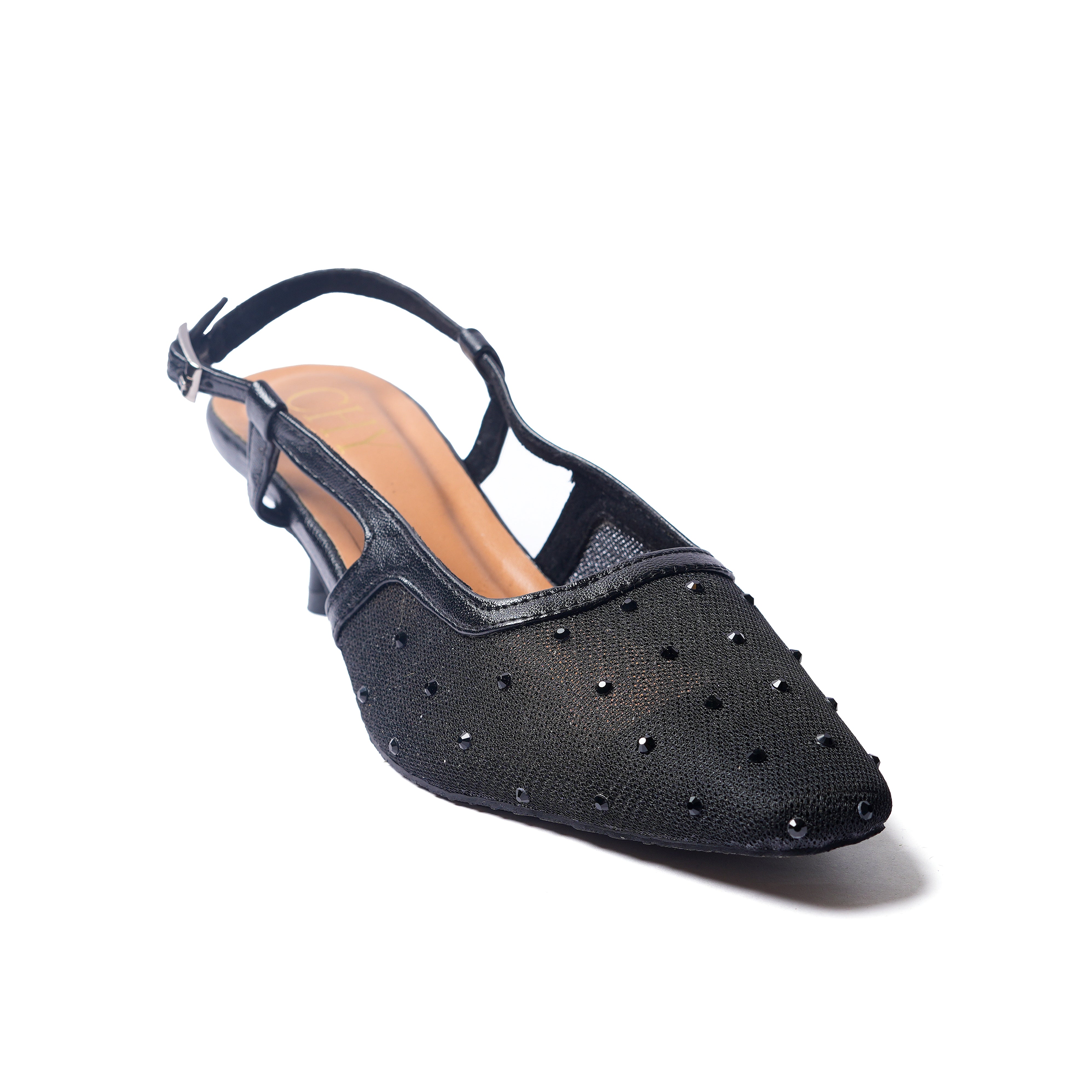 Shine with subtle glamour in our Black Crystal. Crafted in elegant black mesh and adorned with delicate crystal studs, these slingback heels add just the right sparkle to your look. Featuring a sleek pointed toe and a comfortable 2-inch heel, they’re perfect for parties, festive evenings, or classy everyday wear.