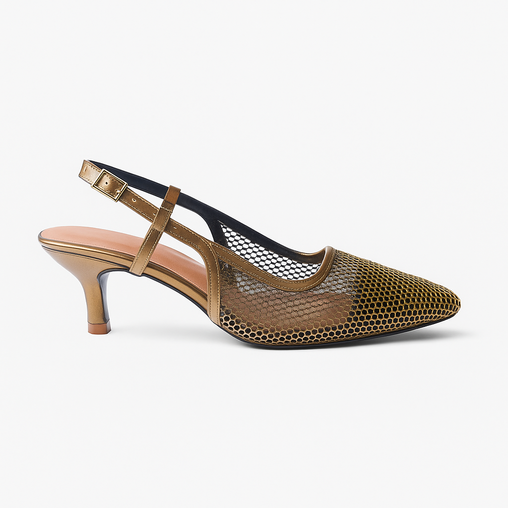 Add a golden touch of glamour with our Golden Gaze. Designed with a chic metallic mesh finish and a modern slingback style, these 2-inch heels bring effortless sophistication to every look. The pointed toe adds a hint of edge, while the cushioned sole keeps comfort by your side all day long.